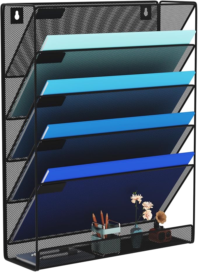 Wall File Organizer Holder Mesh Hanging Paper Document Holder,Vertical 6 Pocket Tier for Office Home, Black