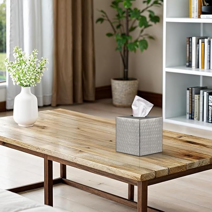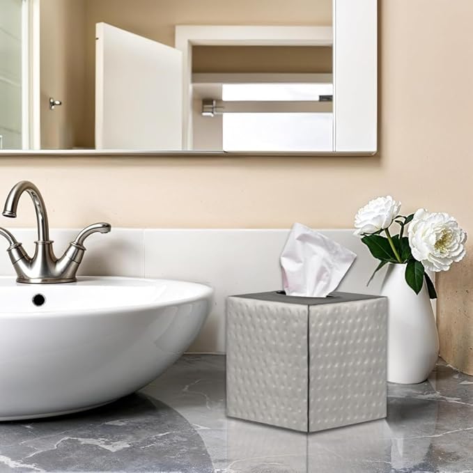 - EASY TO CLEAN & MAINTAIN: Keep your hand-hammered tissue box cover looking like new with a simple wipe from a soft, damp cloth. The low-maintenance surface makes it a favorite among tissue holders decorative enthusiasts who want style without the fuss. Just use a damp, soft cloth to wipe the exterior, keeping this square tissue box cover clean and pristine. This convenient cleaning routine ensures its lasting appeal on bathroom vanities, nightstands, desks, and various surfaces throughout your home and office.