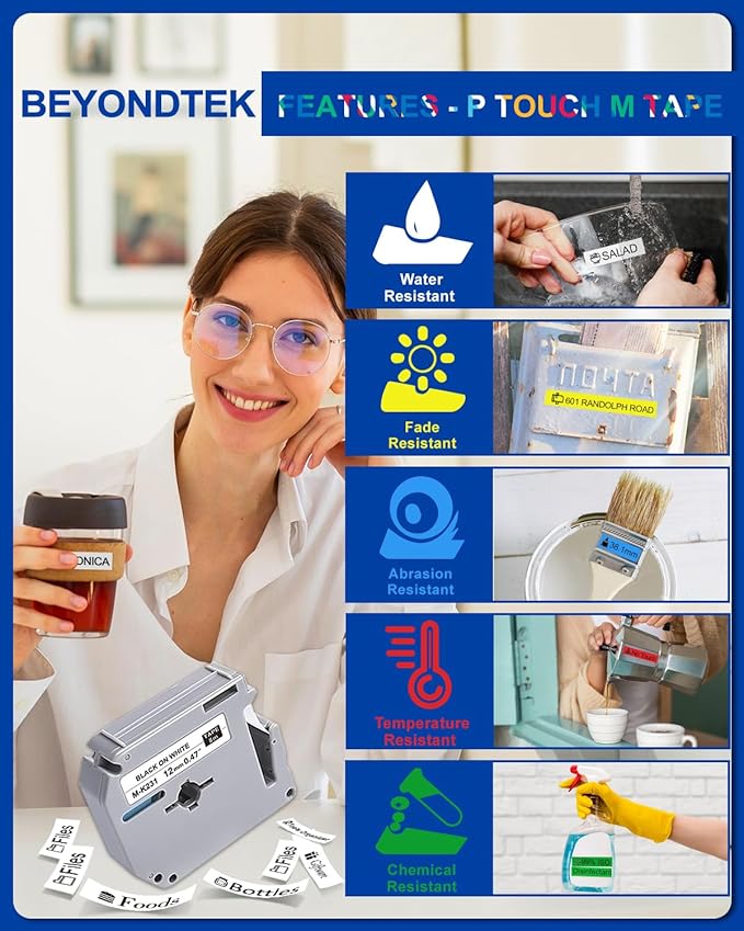 - 【Package Included】 - 6-Pack Compatible with Brother P touch M Tape Label Tape. Color: Black on Clear (MK131), Black on White (MK231), Black on Red (MK431), Black on Blue (MK531), Black on Yellow (MK631), Black on Green (MK731). Size: 1/2 Inch x 26.2 Feet ( 12mm x 8m)