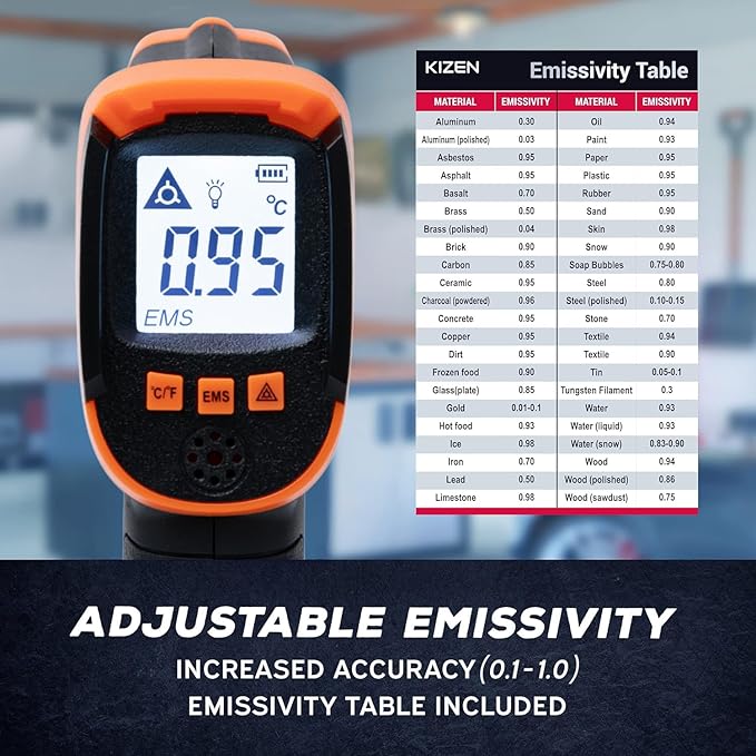 - SUITABLE FOR A WIDE RANGE OF APPLICATIONS: Our laser temperature gun is suitable for both residential and industrial environments. This Kizen laser thermometer excels for checking oven temperatures, as a griddle accessory, and for monitoring vehicle engine temperatures. It is indispensable for HVAC projects and other precise temperature assessments.