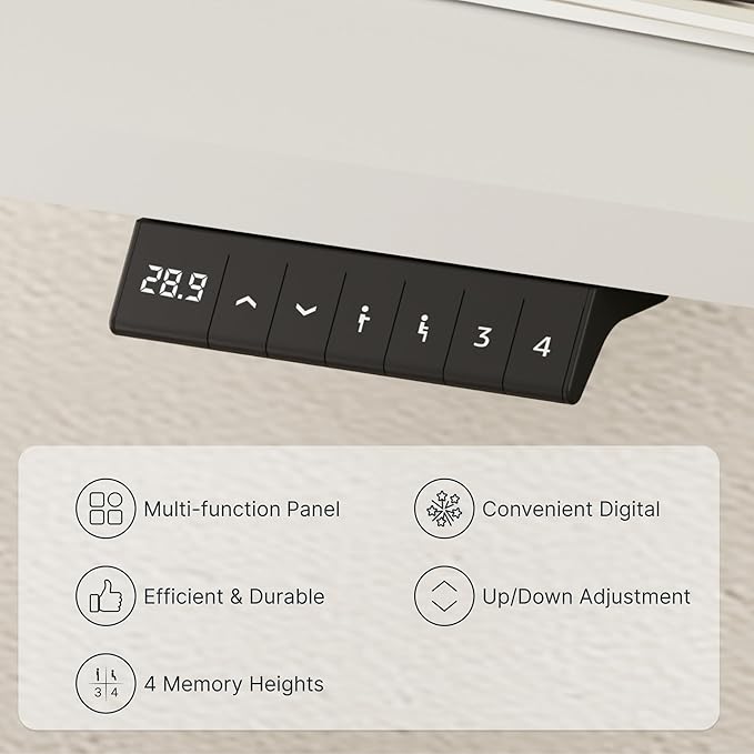 - 4 MEMORY BUTTONS: Easily switch between sitting and standing positions with our 6-button digital controller that features 4 programmable memory presets. The motorized height-adjustable system adjusts smoothly from 28.1” to 45.7”, and the motor runs quietly at less than 50 dB.