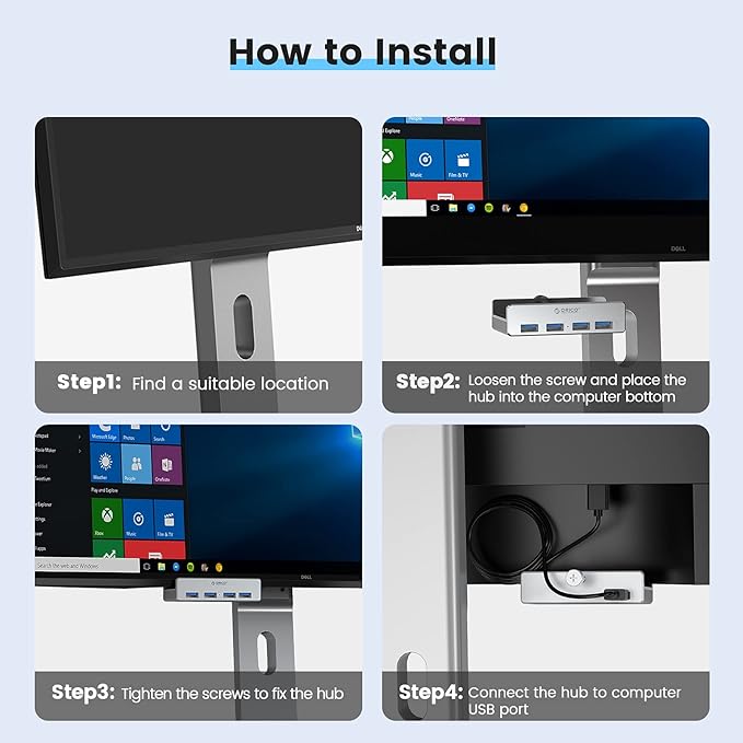 - 【New Clampable Hub Design】A snap-on 4 port USB 3.0 hub with back clip, you can fix the hub in a straighter position as you like, and use the clip to fix it on the desktop, nightstand or the side of the monitor, save your desktop space better and the clip spacing is 0.2in-1.2in. (Tip: Please measure the thickness of the table or monitor before purchase. Curved surfaces with rounded edges and large arcs may not be easy to tighten.)