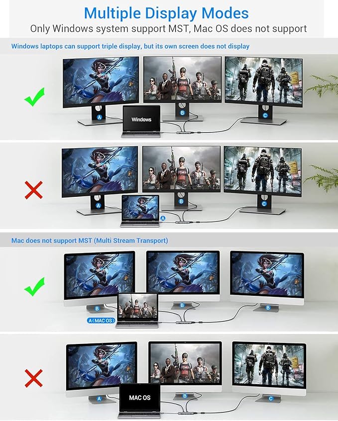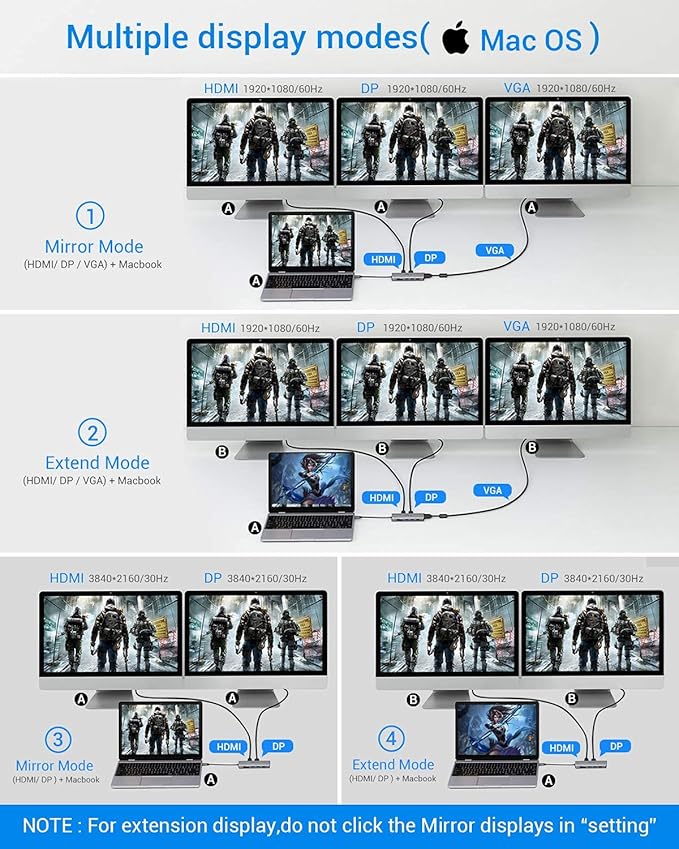 - Massive Docking Station: Please make sure that your laptop Type C port support DisplayPort Alt Mode and Power Delivery. Only mirror display for macOS system. The usb c hub is incompatible with the USB-A to USB-C Adapter.
