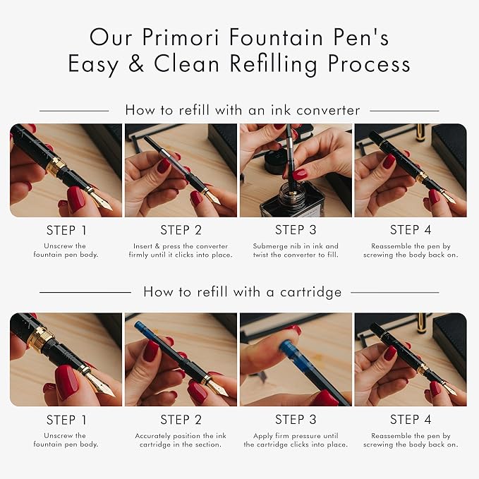 - ✒️Express Yourself Through Effortless Writing - Built to offer a delicate weight that is perfect for both left and right handed writers, this Primori fountain pen set will be your best writing tool that you carry around and bring with you everywhere. With the smooth lines, consistent flow, your lines will always glide across the page whether it is notes in your agenda or doodles on the side of a page. With zero ink leakage and cap cover, this is the perfect writer's pen.