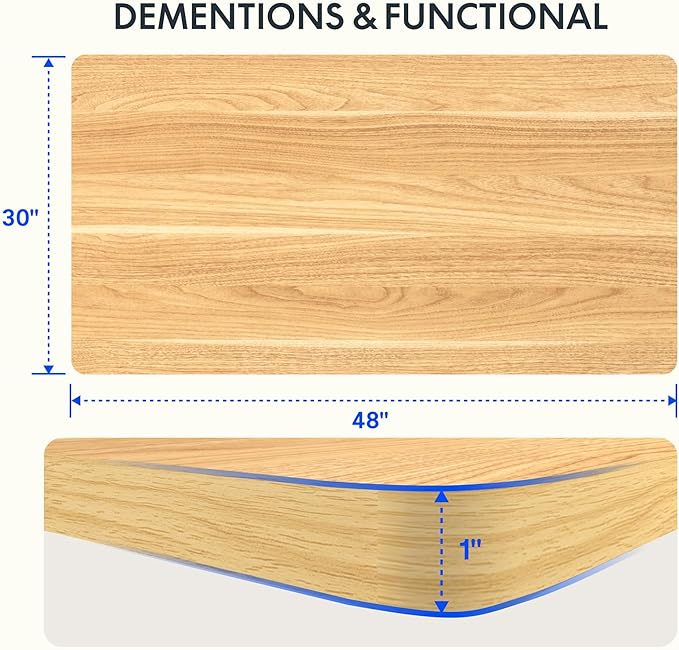 - AMPLE WHOLE-PIECE DESKTOP: With its whole-piece 1” eco-friendly desktop, this standing desk provides plenty of room for your computer setup, documents, and accessories, creating a well-organized and productive work environment. Due to hand measurements, desktop dimensions may vary slightly by 0 to 1”.