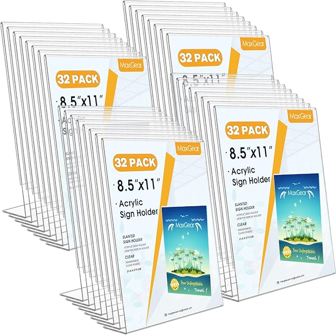 MaxGear Acrylic Sign Holder 8.5 x 11 Inches , Clear Sign Holders Plastic Display Stand Slant Back Countertop Display Picture Frames for Menus, Flyer, Use In Office, Store, 32 Pack