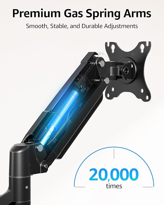 - Premium Pneumatic Arms - Extensive quality testing ensures your computer monitors stay stable and secure. The monitor arm offers full monitor movement with 19.9" of arm extension and 9.4'' of height adjustment range. The dual monitor arm with a pneumatic system provides smooth and durable adjustments. Please adjust the tension of the pneumatic arm properly according to the weight of your monitor.