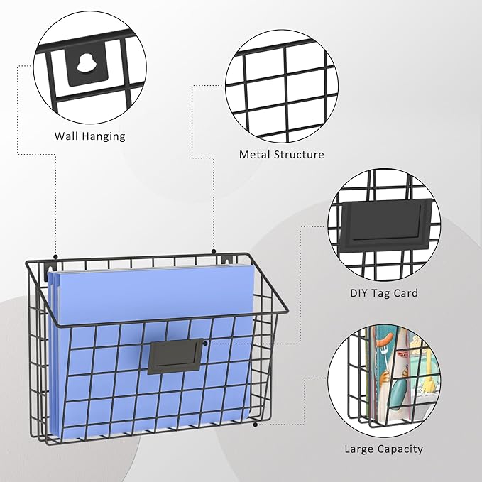 - Save More Space: By fully utilizing vertical space, this file wall hanger helps you efficiently organize items and keep your desktop tidy. It effectively stores files, magazines, and mail, and comes with 3 blank tag papers for easy categorization. Warm tip: The product's round hole has been upgraded to a more sturdy gourd-shaped hole, enhancing durability and installation convenience.