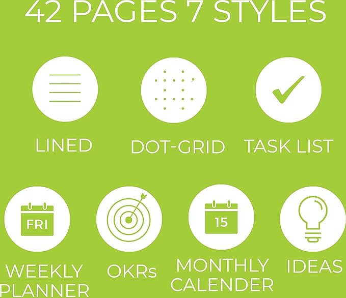 - 7 Versatile Page Templates: Plan for life and work with Monthly & Weekly Calendar, To-Do List, Goal Tracker, Idea List, and both Dotted and Lined Notebook Pages. Diverse for everything from project management to fitness tracking to household planning.