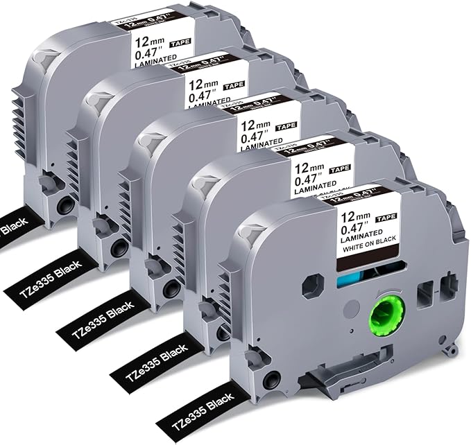 - Package Includes: 5 Pack Compatible with Brother p touch TZe-335 white on black label tape; Size: 12mm (0.47 in) x 8m (26.2 ft), Color: White on black labels