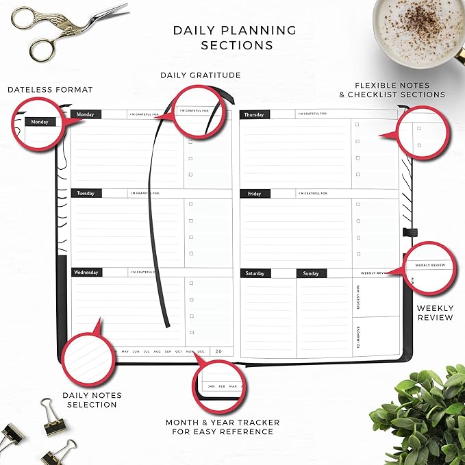 - ā VEGAN FRIENDLY, ELEGANT and ATTRACTIVE DESIGN - Our undated daily and monthly school planner would make a great gift for college students. Includes 3 silk bookmarks for multi-section planning, an elastic strap closure and an expandable inner back pocket.