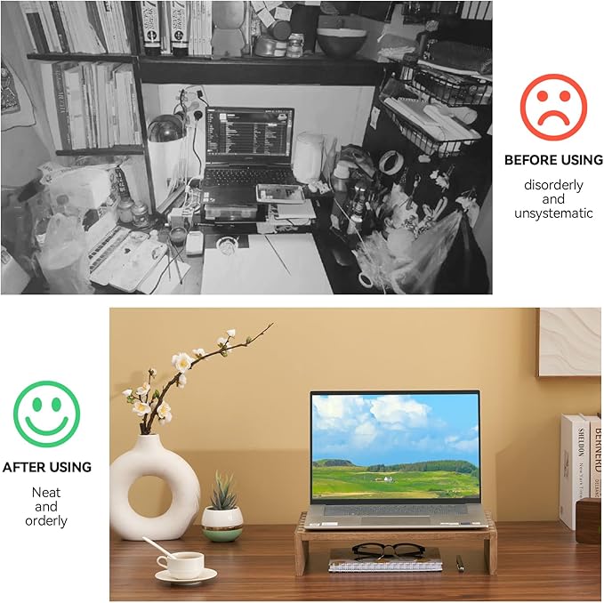 - [FULLY ASSEMBLED & STRONG BEARING]: Without installation,the wood desk monitor stand is fully assembled. Structure is simple but bearing is strong.