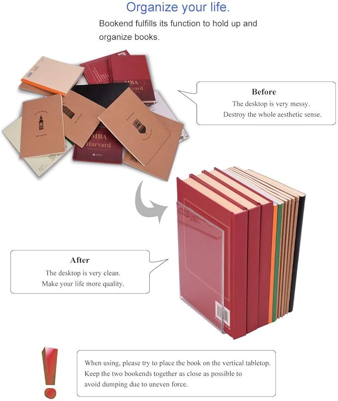 - SUITAABLE FOR MULTIPLE SCENES - A transparent bookend will be easier to match than any colored bookend. Whether you use it on a bookcase, on a desk, in the office, or in a classroom, you don't have to worry about collocation.