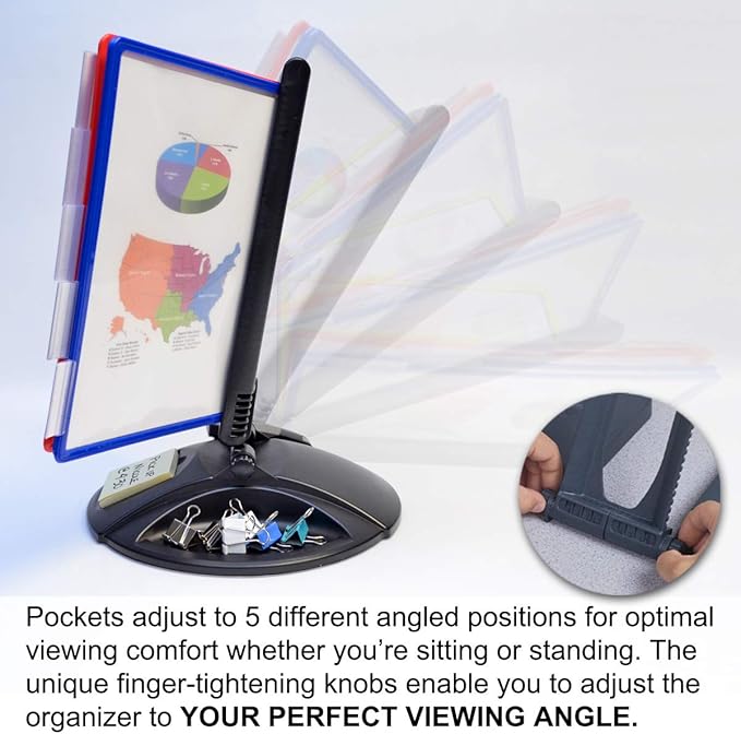 Ultimate Office AdjustaView 10-Pocket Desk Reference Organizer with Supplies Storage Base and EZ-Load Pockets to Hold 20 Sheets of Paper, Includes Fast Find Indexing Tabs (Colored Pockets)