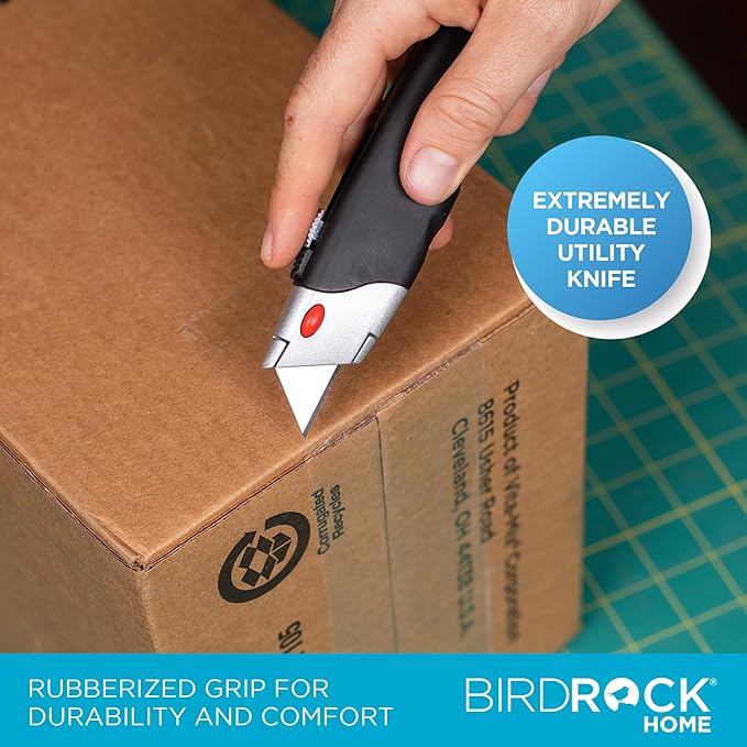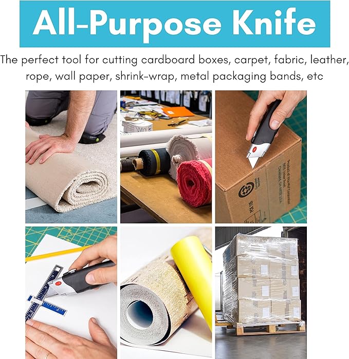 - HEAVY-DUTY: Metal, durable design with a textured grip allows for long-lasting, highly durable cuts and slices on boxes, plastic packaging, carpet, leather, wallpaper, rope, cardboard cartons, and straps. Perfect box cutter utensil for any job or project