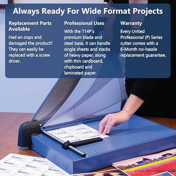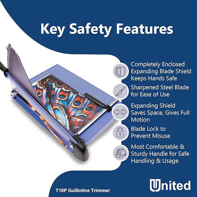 - SAFE AND EASY: Hands are kept safely away from the heavy duty paper cutter blade by a sturdy ABS plastic shield. This built-in safety guard provides peace of mind without compromising on efficiency. Easily align sheets for precise and accurate cuts with the alignment grid on the paper cutter board, dual scale ruler with inch and metric markings, and locking side guide.