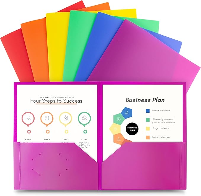 - 6 Vibrant Colors: Plastic folders with pockets available in a variety of colors and multi-packs, Blue folder, red folder, purple, orange, yellow plastic folder, green plastic folder with pockets.