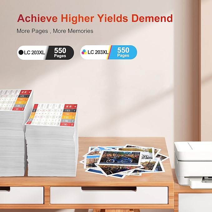 - High Page Yield: Up to 550 pages per LC203XL LC203BK, 550 pages per LC201CL Bother Ink Cartridges Color (Based on 5% coverage)