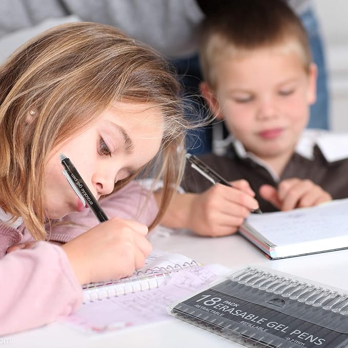 - 【Top Quality】: 18 black erasable gel pens with 0.7mm fine tip, superior ink and soft rubber grip make the pens writing smoothly and using durable! Great pens for note taking, kid doodling, sketching, writing and getting creative in a fun and skilled way.