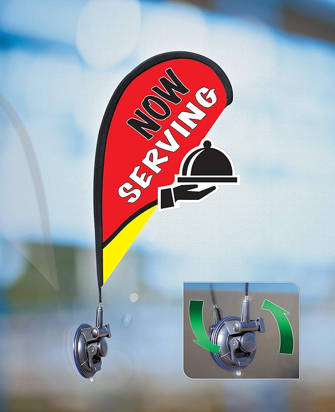 - 3D Window Flag Kit Includes: 1 - Now Serving Flag Kit with Suction Cup Attachment