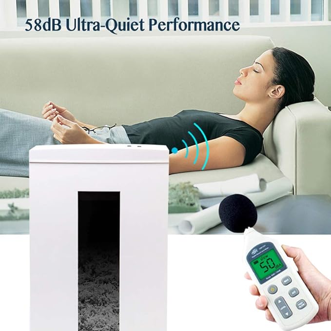 - 【Ultra-Quiet Performance】Low noise level 58dB ultra-quiet performance; 6 gallons pull-out waste bin with large easy viewing transparent window. Perfect for a home paper shredder or a quiet paper shredder for office environments.