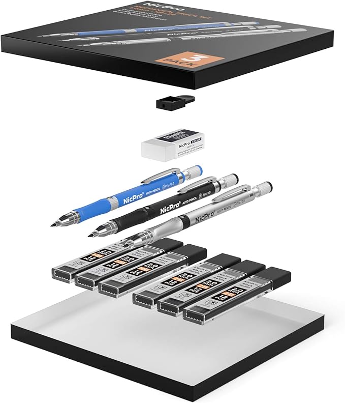 Nicpro 11 Pieces 2mm Mechanical Pencil Set, 3 PCS Carpenter Drafting Pencil 2.0 mm for Art Drawing Writing Sketching Construction with 6 Tube Pre-Sharpen HB & 2B Refill, Eraser, Sharpener