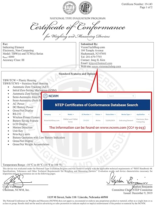 - Lb/Kg/Oz Switchable, Easy Operating, Adapter included, Built-in Rechargeable Battery, NTEP Certificate, Indicator CC# : 19-143, Platform, CC# : 19-144