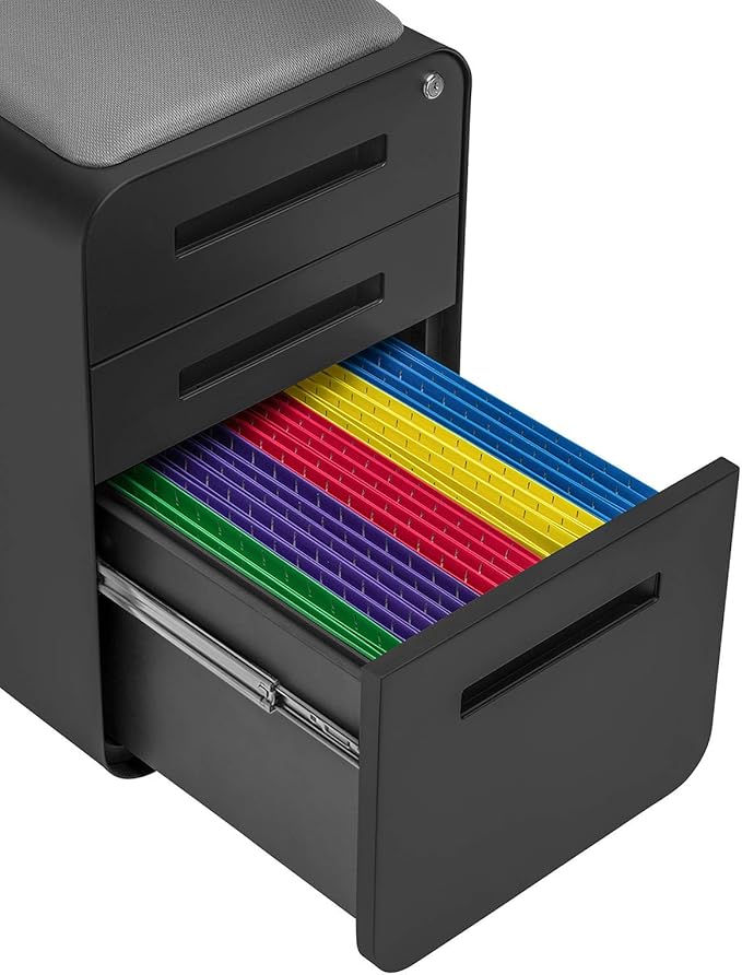 Laura Davidson Furniture STOCKPILE Curve Seated 3-Drawer Mobile File Cabinet with Removable Magnetic Cushion Seat - Metal Filing Cabinet, Pre-Assembled, Black with Dark Grey Cushion