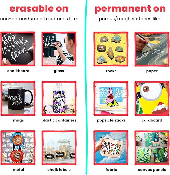 - Comes Off Easy - The white chalk marker will work on almost any surface! These chalk board markers are washable & will erase off on non-porous surfaces such as glass & mirrors (dry & wet erase) & permanent on porous surfaces (like wood).