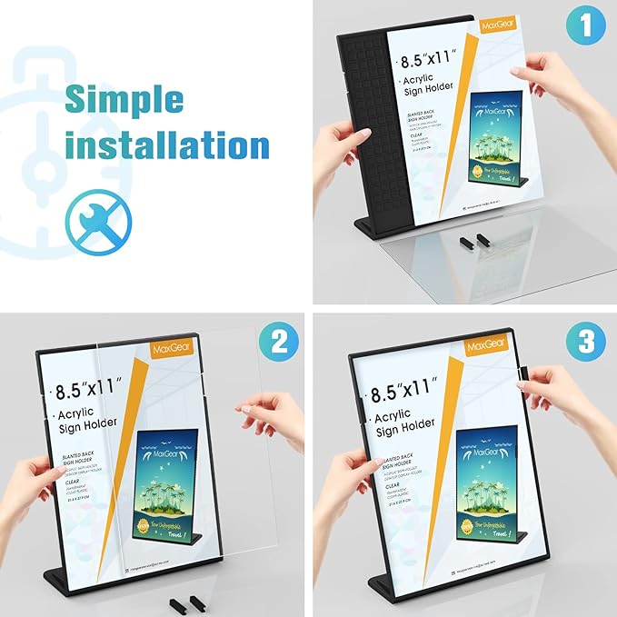 - Easy to Use: 1. Insert your poster or brochures into the sign frame. 2. Place the clear acrylic sign cover on top. 3. Install and buckle the clasps on both sides. This assembles a clear 8.5x11 acrylic sign holder