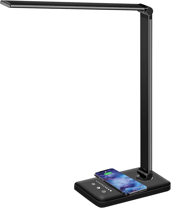 LED Desk Lamp with Wireless Charger, USB Charging Port, Dimmable Eye-Caring Desk Light with 5 Brightness Levels & 5 Lighting Modes, Touch Control, Auto Timer (Black)