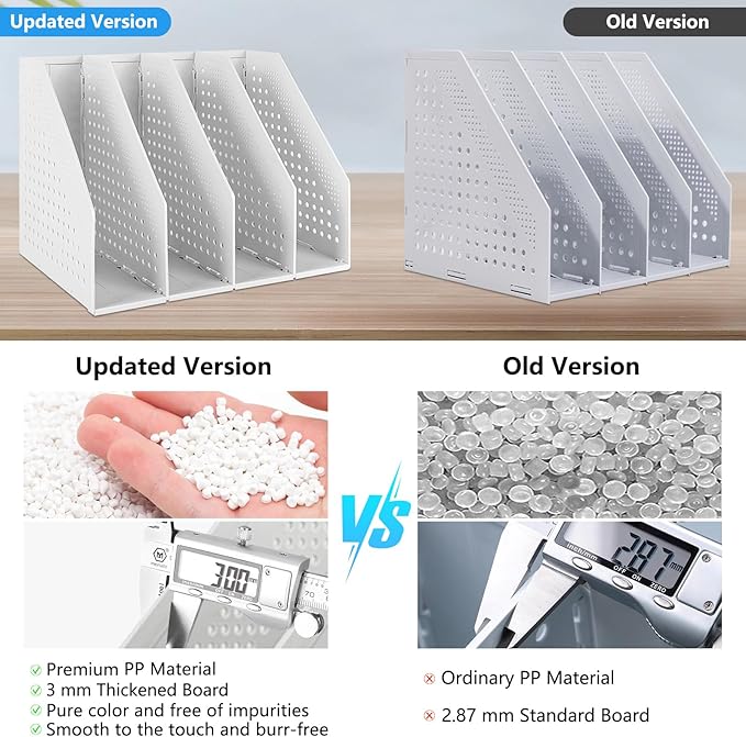 - STURDY AND DURABLE: The stand book organizer is made of premium PP material with 3 mm thickened dividers, strong and stable structure, strong load-bearing capacity. The surface of the file sorter is flat and smooth without hurting your hands. Each slot is 3 inches.