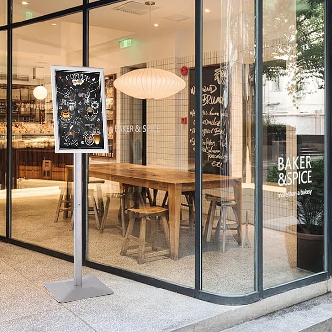 - Easy Poster Changes,Multiple Usage - Front load open snap frame for quick and easy poster changes. Sturdy metal material floor standing sign holder,ideal for exhibition,showrooms, restaurant, supermarket, shopping malls for posters.