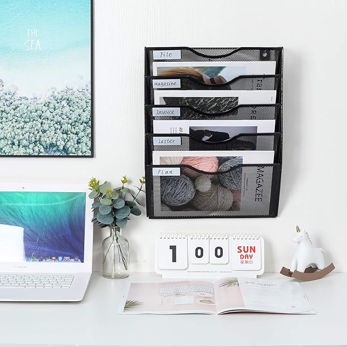 - ▶Multipurpose and Space-saving Design. The wall file holder has 5 separate oblique slots, which is great for sorting files, documents, magazines, literature, catalogs, mail, brochures, manilla envelopes and notebooks. Take full advantage of your vertical space and keep your desktop empty and tidy