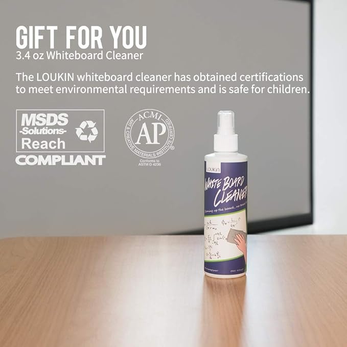 - Cleaner Included: 3.4 fl oz whiteboard cleaner (AP certification, non-toxic & low-odor) included. Effectively clean stubborn marker ink with the loukin cleaner
