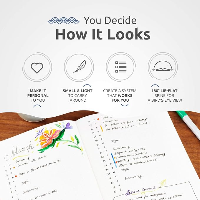 - 180° LAY-FLAT DOTTED GRID JOURNAL WITH A STAY OPEN DESIGN: get a bird’s-eye view of your notes as this unique dotted paper notebook lies completely flat to make bullet-journaling faster; designed with a perfectly aligned continuous grid across both sides of the page, ideal for sketching, organizing and journaling.