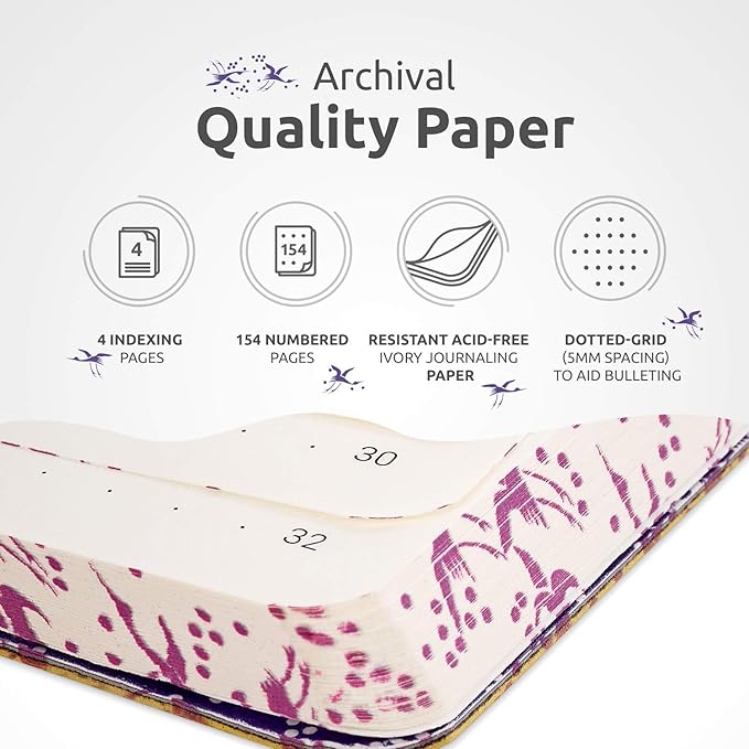 - NON-BLEED 120GSM THICK PAPER: This art journal contains 80 sheets (160 pages) of acid-free, smooth, ivory, non-bleed 120 gsm thick dotted notebook paper that is ink-proof and won’t create feathering if you use a fountain pen, or similar. It includes 4 indexing pages and archiving label stickers to help you keep track of things.