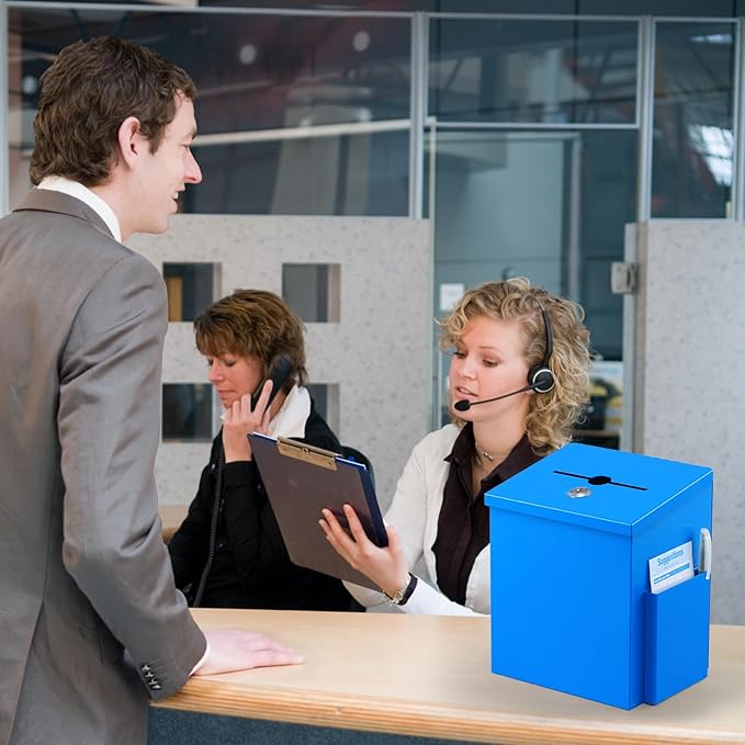 xydled Wall Mounted Ballot & Donation Box with 50 Suggestion Cards, Metal Suggestion Collection Box with Key Lock, Blue, 8.7"x 5.9"x7.1"