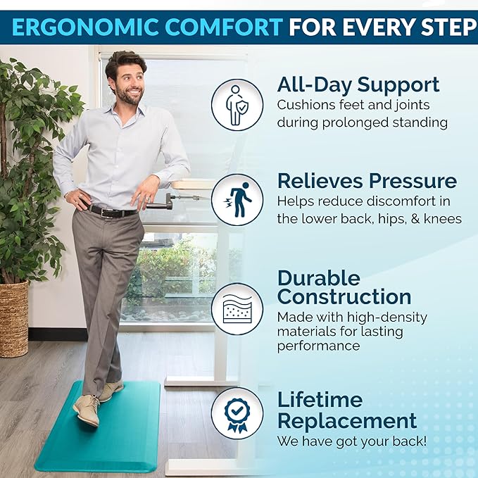 - Anti Fatigue Mat: The ComfiLife anti-fatigue floor mat enhances comfort while standing. It is professionally engineered and can be used as padded kitchen mat or for your standup desk that will not lose support over time