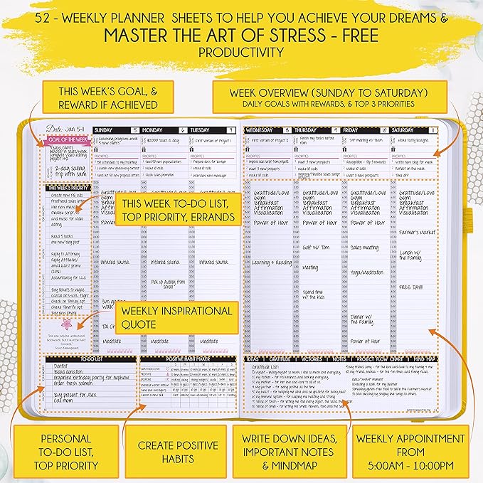 - INCREASE PRODUCTIVITY AND HAPPINESS - This is a deluxe life goal planner showing you how to become the best possible version of yourself on a mental, physical & interpersonal level using the law of attraction vibration guide. This planner is a daily planner, monthly planner, weekly planner, productivity planner, goal planner, business planner, to do list planner, planner notebook & gratitude journal all-in-one.