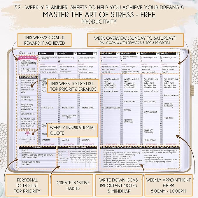 - INCREASE PRODUCTIVITY AND HAPPINESS - This is a deluxe life goal planner showing you how to become the best possible version of yourself on a mental, physical & interpersonal level using the law of attraction vibration guide. This planner is a daily planner, monthly planner, weekly planner, productivity planner, goal planner, business planner, to do list planner, planner notebook & gratitude journal all-in-one.
