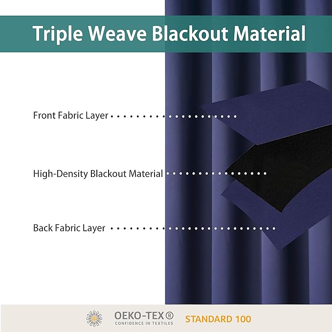 - PREMIUM BLACKOUT MATERIAL: Our room darkening curtain is made of 100% polyester fabric and have the same color with the front and back. Crafted in a certified STANDARD 100 by OEKOβTEX factory from a durable soft and thick triple weave blackout fabric which block out 90% above sunlight and UV rays. Darker colors work better.