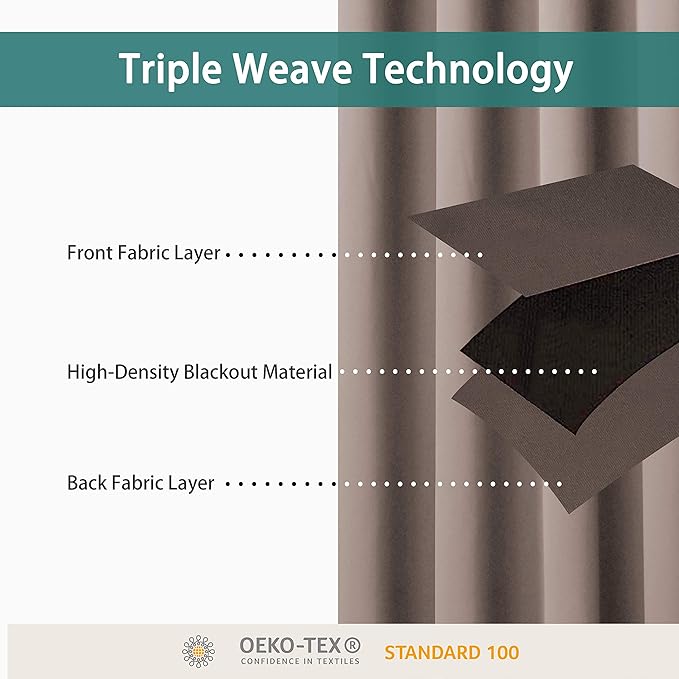 - PREMIUM BLACKOUT MATERIAL: Our room darkening curtain is made of 100% polyester fabric and have the same color with the front and back. Crafted in a certified STANDARD 100 by OEKOβTEX factory from a durable soft and thick triple weave blackout fabric which block out 90% above sunlight and UV rays. Darker colors work better.