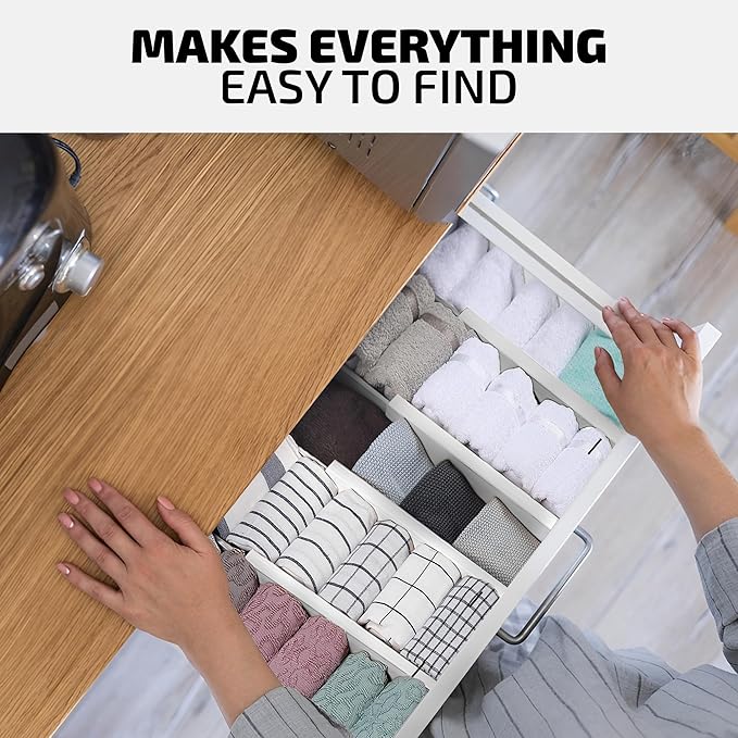 - Easy to Use with Added Protection: Simply slide the divider into place in any kitchen, bedroom, office, or bathroom drawer. Equipped with EVA foam padding, it protects your drawers from scratches and ensures the divider stays securely in place without slipping. Achieve organized storage in seconds, with the flexibility to remove or reposition as needed.