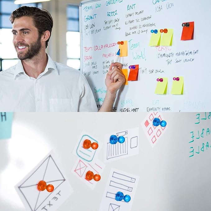- SMALL STRONG MAGNETS: Each powerful magnet holds up to 11 sheets of paper on any metallic surface. No more sliding papers with cheap magnets. These push pin magnets are tiny too so they won't cover up exact things you want to display.