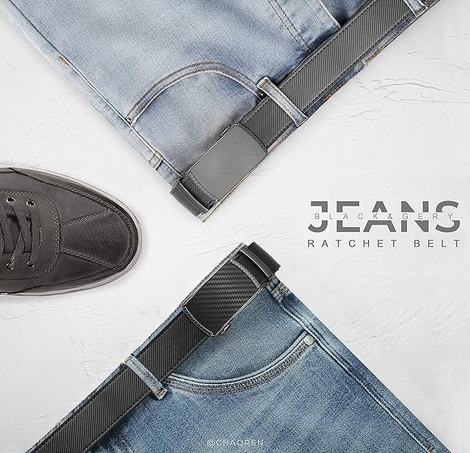 - EASY TO USE - Slide the black and grey belt into the buckle, and click on the buckle to lock it automatically. Gently push the lever on the side of the automatic buckle, and pull the casual jeans belt to release. Simple, smooth, and sleek!