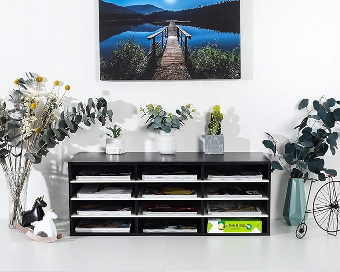 PAG Mail Sorter, Wood Countertop Literature Organizer, Student Mailbox for Classroom, Desktop Bill Paper Organizer for Office Home School, 12 Compartments, Black & White