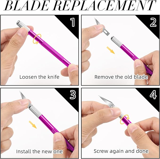 - The xacto knife is designed with a convenient blade replacement system that allows for quick and hassle-free blade replacement. You won't have to worry about the process of changing blades, making your cutting tasks more efficient and time-saving.