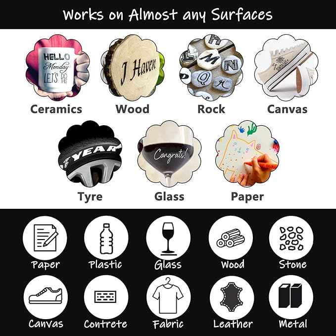 - WORKS ON ALMOST ANY SURFACES: The black paint pens works on almost any surfaces such as rock, canvas, wood, metal, glass, ceramic, plastic, tire, etc. They are the best tool for creativities