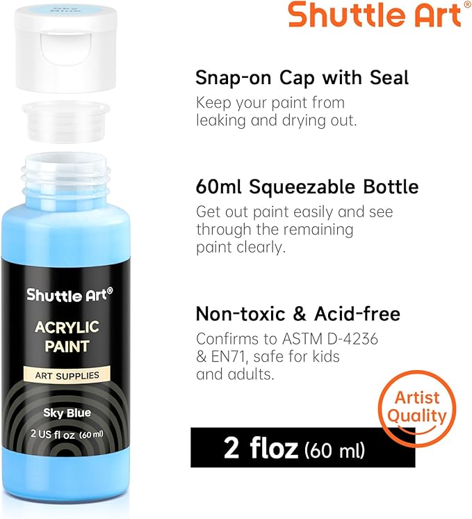 - 50 VIBRANT COLORS : Shuttle Art Acrylic Paint Set comes with 50 colors acrylic paint in 60 ml/2 oz bottles, providing the most commonly used colors and inspiring hot fluorescent and metallic colors to your art projects, ideal for painting and crafting